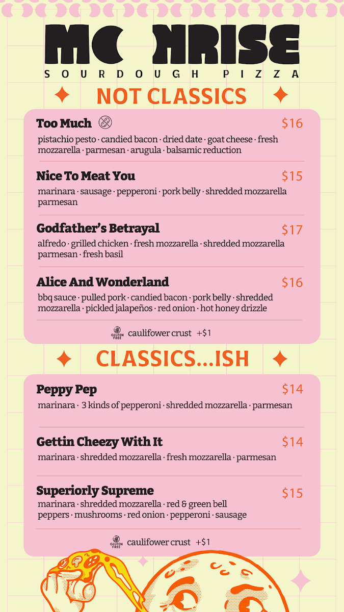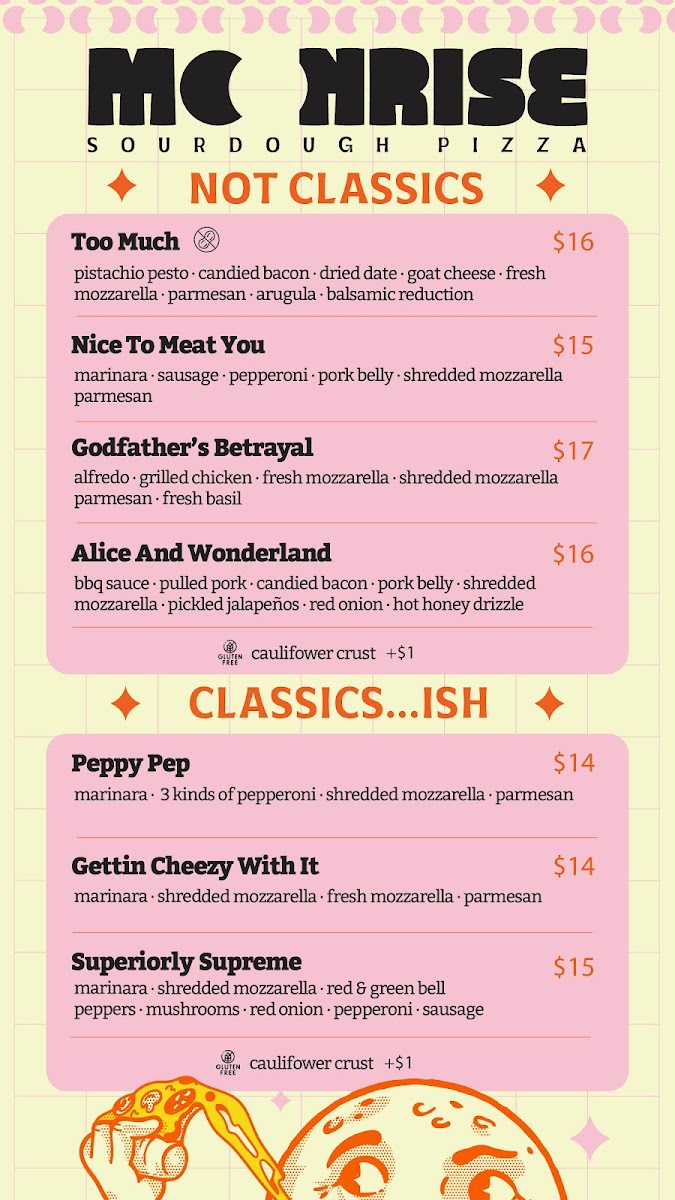 If you're craving something delicious and unique, the Moonrise Sourdough Pizza Menu is the perfect place to start. Located at 7921 E 119th Dr, Suite A in Bixby, OK, this cozy spot brings a fresh twist to traditional pizza with its perfectly crafted sourdough crust, offering a balance of crisp and chewy in every bite. Whether you're a fan of classic Margherita or prefer something more adventurous like the tangy BBQ Chicken or the savory Mushroom Truffle, there's something for every palate. The menu is designed to satisfy, featuring a range of creative toppings and ingredients that elevate each pizza to a whole new level. Don’t forget to pair your meal with a refreshing drink from their selection, which complements the bold flavors of the pizza. It's not just a meal - it's an experience worth savoring, with every slice delivering something a little different, but always delicious.